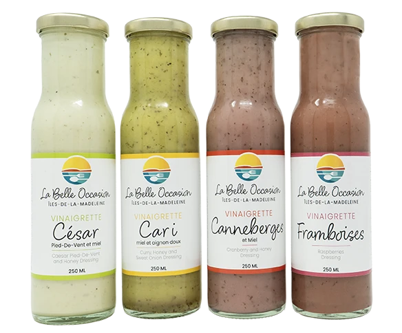 Passionnés de produits de qualité et à la recherche constante de saveurs authentiques, nous avons décidé de créer de délicieux produits aux allures d’archipel. Depuis 2010 et née à la Pointe-Basse, La Belle Occasion propose chaque saison de nouvelles découvertes : Vinaigrette césar Pied-De-Vent et miel, cari miel et oignon doux, canneberges et miel, framboises ainsi que ses caramels café des Îles, sel de mer des Îles, bière des Îles et bien d’autres saveurs.